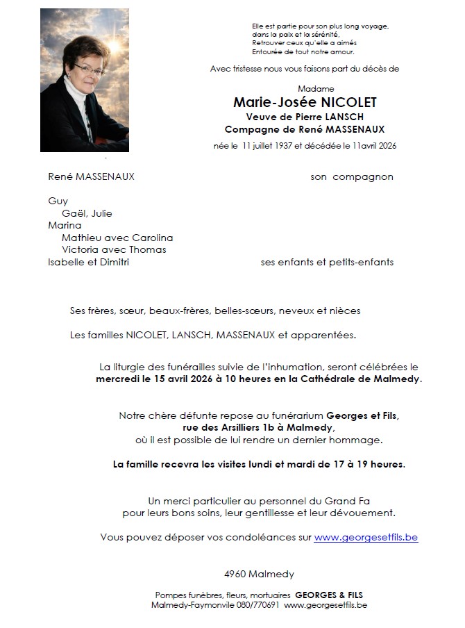 Avis de décès de Madame Marie Josée NICOLET veuve de Pierre LANSCH