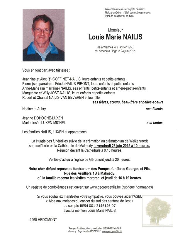 Décédé à Liège (4000) le mardi 23 juin 2015 à l'âge de 59 ans