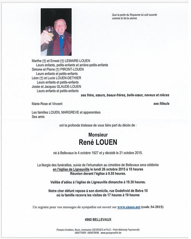 Décédé à Bellevaux-Ligneuville (4960) le mercredi 21 octobre 2015 à l'âge de 88 ans