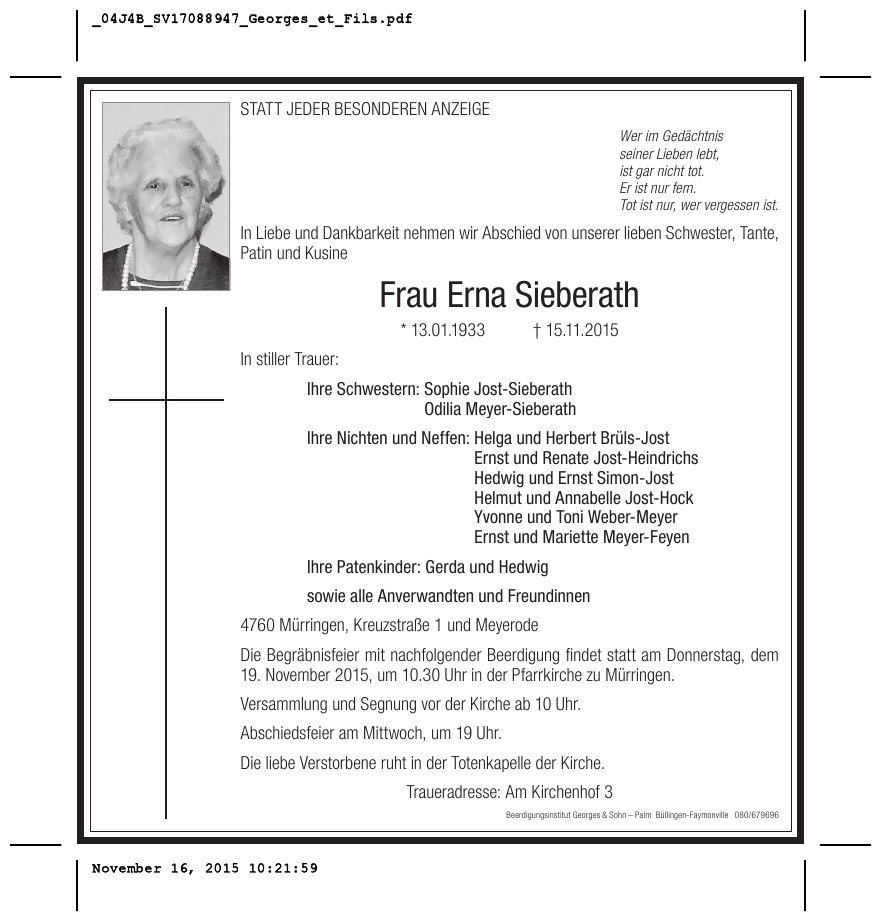 Décédée à Verviers (4800) le dimanche 15 novembre 2015 à l'âge de 82 ans