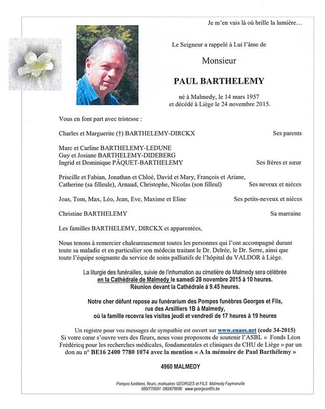 Décédé à Liège (4000) le mardi 24 novembre 2015 à l'âge de 58 ans
