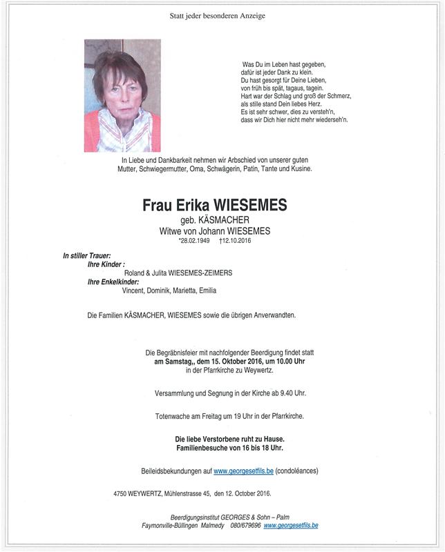 Décédée à Weywertz (4750) le mercredi 12 octobre 2016 à l'âge de 67 ans
