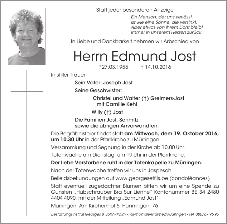 Décédé à Mürringen (4760) le vendredi 14 octobre 2016 à l'âge de 61 ans