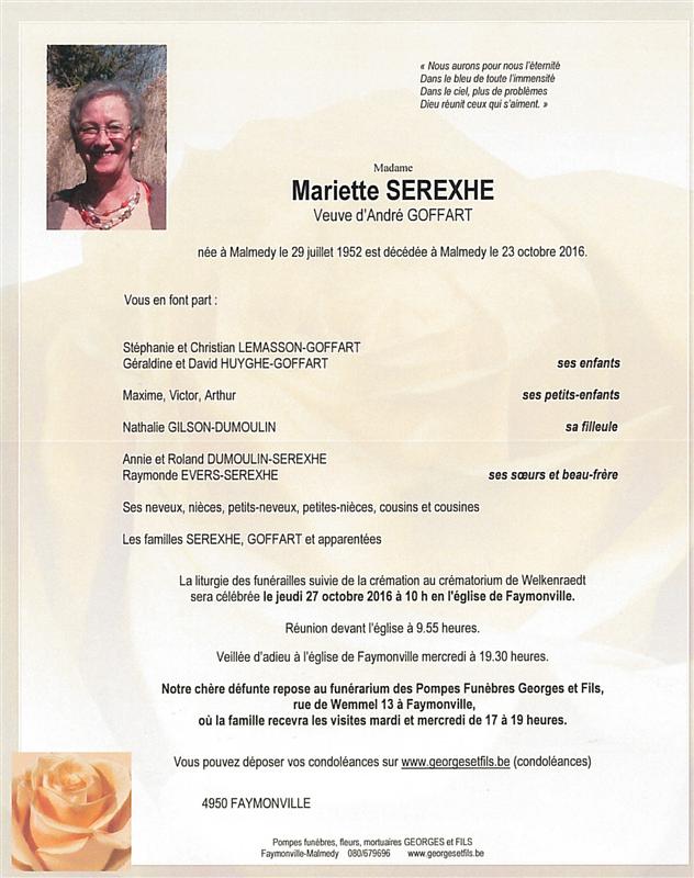 Madame Mariette SEREXHE veuve d'André GOFFART