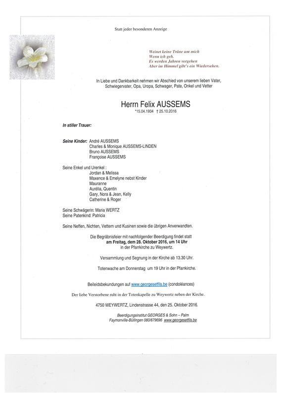 Décédé à Eupen (4700) le mardi 25 octobre 2016 à l'âge de 82 ans