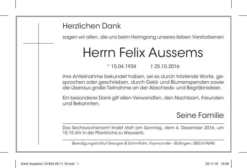 Décédé à Eupen (4700) le mardi 25 octobre 2016 à l'âge de 82 ans