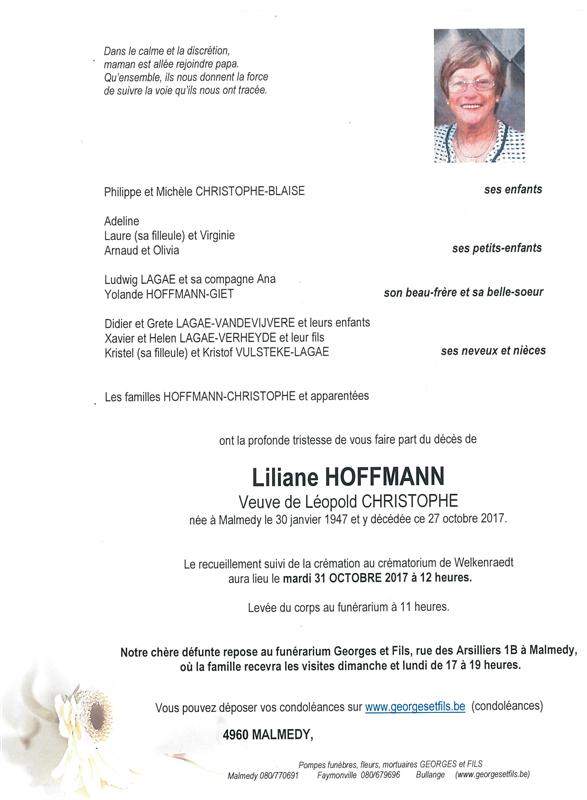 Madame Liliane HOFFMANN veuve de Léopold CHRISTOPHE