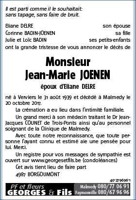 Décédé à Malmedy (4960) le vendredi 20 octobre 2017 à l'âge de 78 ans