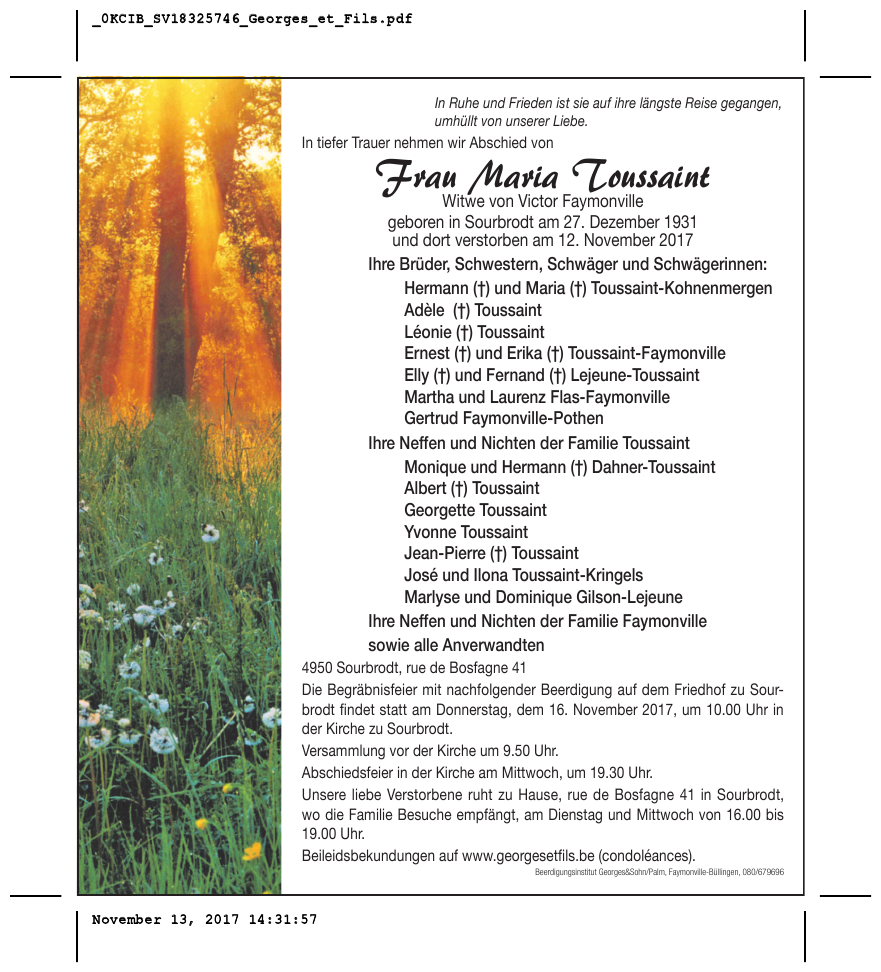 Décédée à Sourbrodt (4950) le dimanche 12 novembre 2017 à l'âge de 85 ans