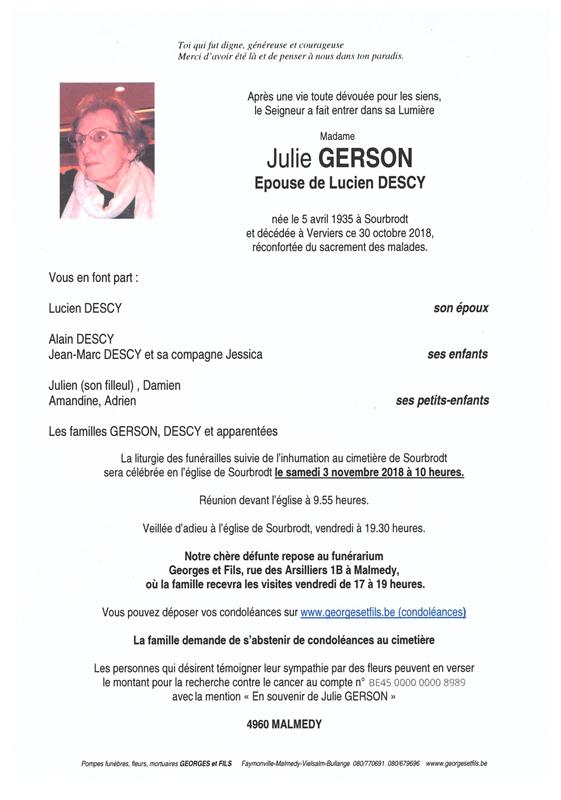 Décédée à Verviers (4800) le mardi 30 octobre 2018 à l'âge de 83 ans