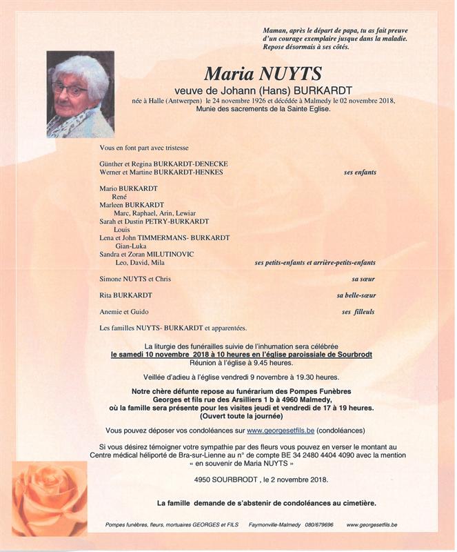 Décédée à Malmedy (4960) le vendredi 2 novembre 2018 à l'âge de 91 ans