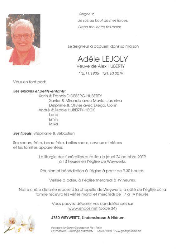 Décédée à Waimes (4950) le lundi 21 octobre 2019 à l'âge de 83 ans