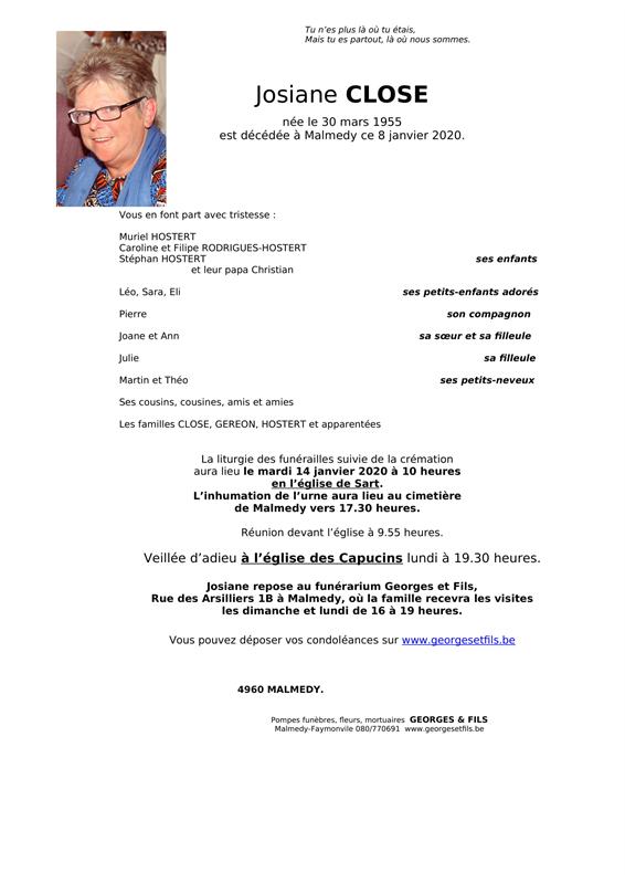 Décédée à Malmedy (4960) le mercredi 8 janvier 2020 à l'âge de 64 ans