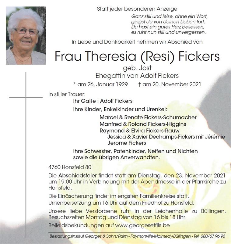 Décédée à Saint-Vith (4780) le samedi 20 novembre 2021 à l'âge de 92 ans