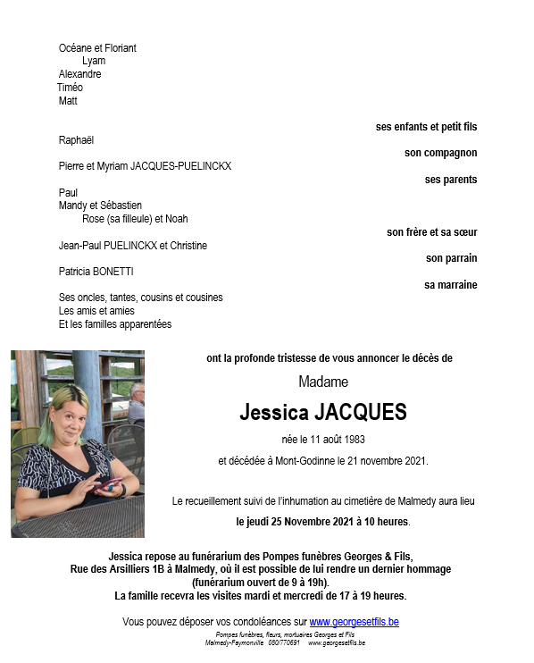 Décédée à Yvoir (5530) le dimanche 21 novembre 2021 à l'âge de 38 ans