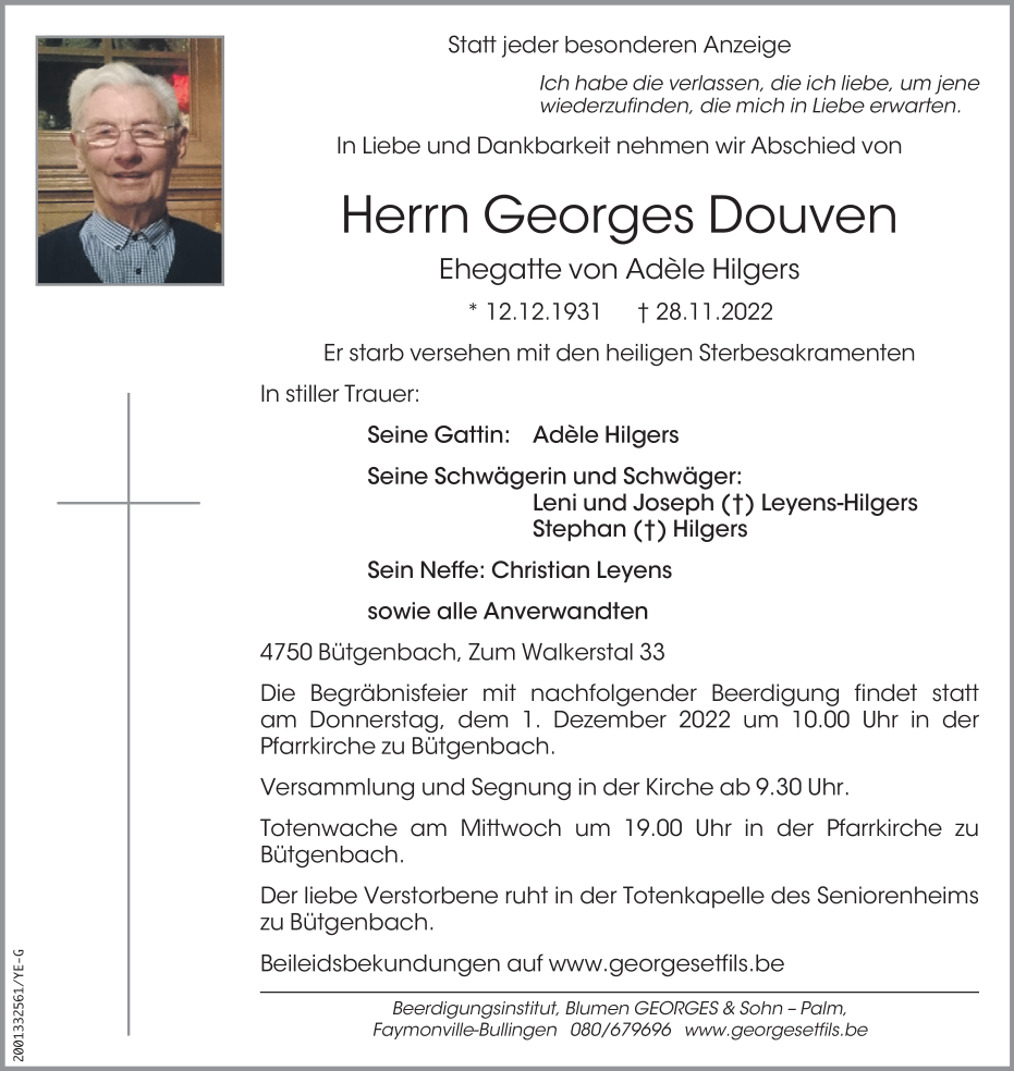 Décédé à Bütgenbach (4750) le lundi 28 novembre 2022 à l'âge de 90 ans