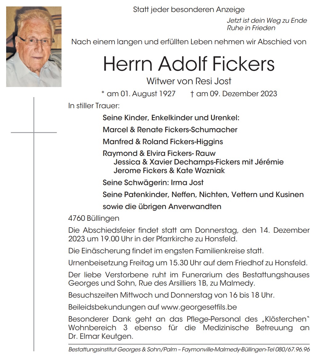Décédé à Eupen (4700) le samedi 9 décembre 2023 à l'âge de 96 ans