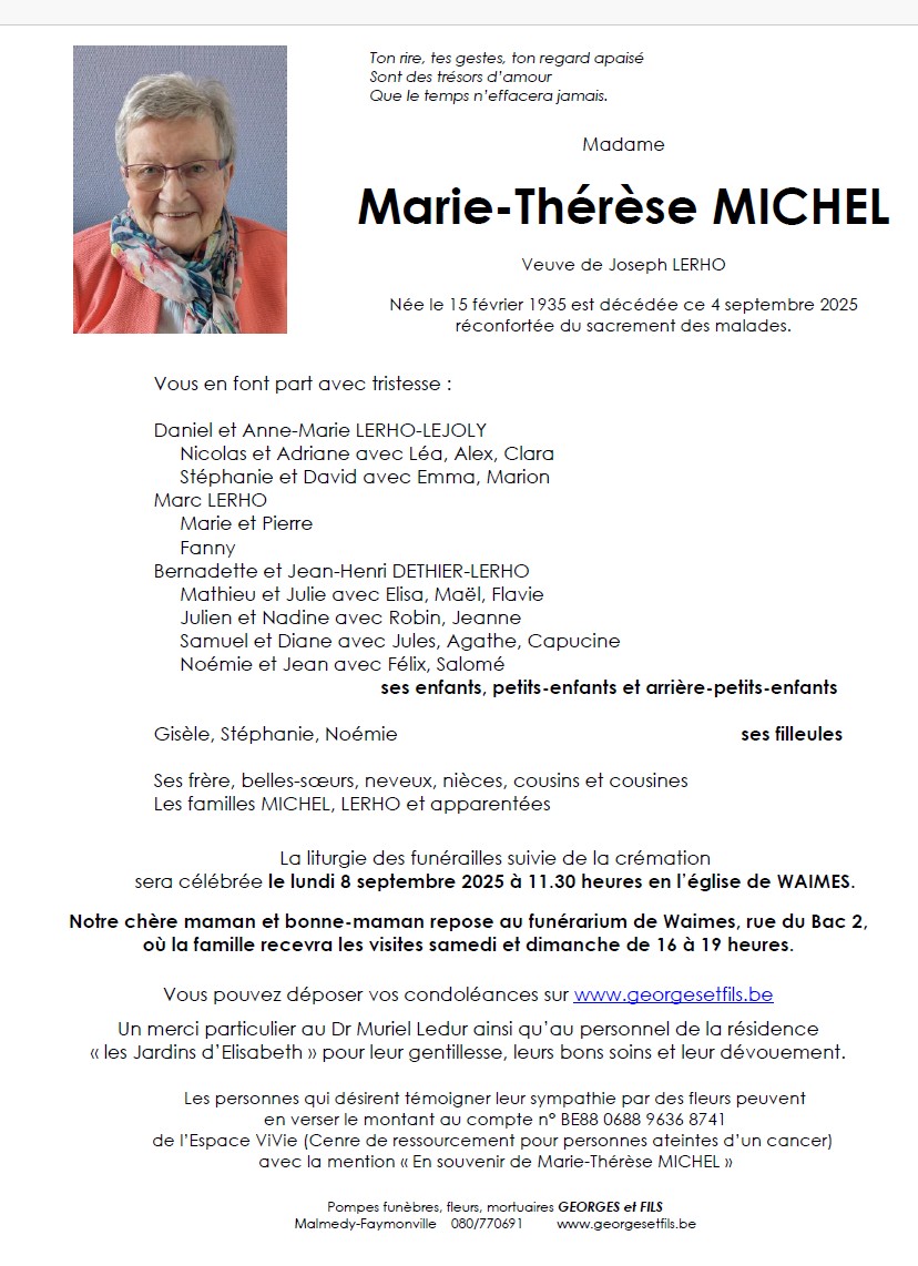 Décédée à Waimes (4950) le jeudi 4 septembre 2025 à l'âge de 90 ans