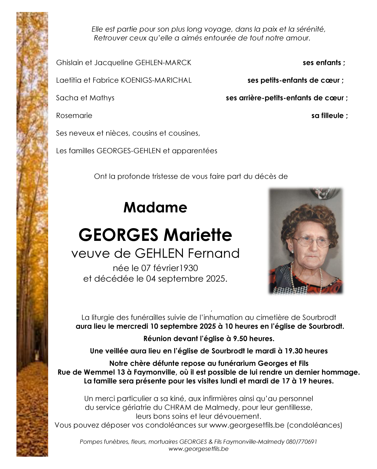 Décédée à Malmedy (4960) le jeudi 4 septembre 2025 à l'âge de 95 ans