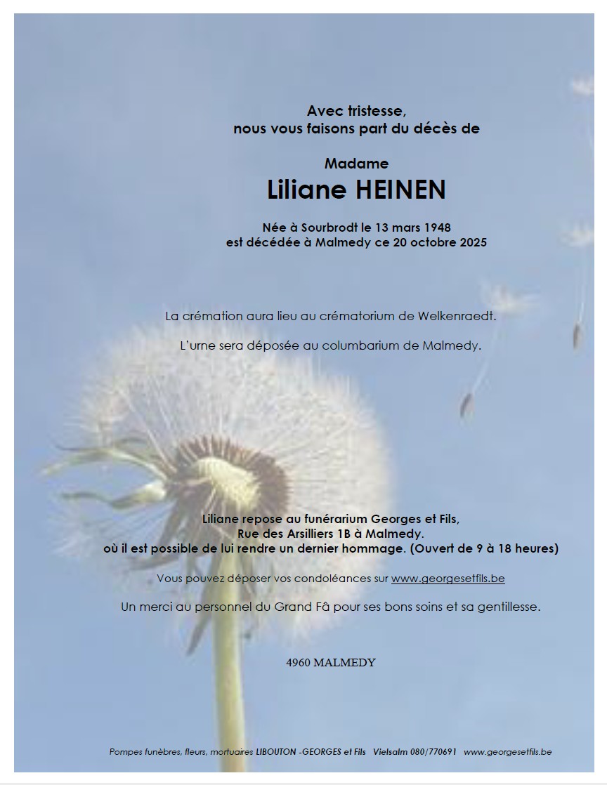Décédée à Malmedy (4960) le lundi 20 octobre 2025 à l'âge de 77 ans
