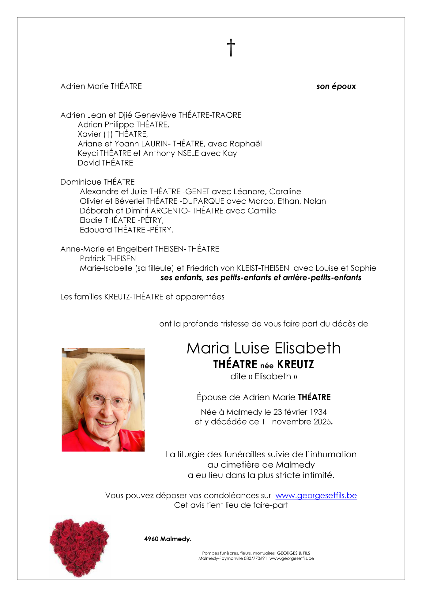 Décédée à Malmedy (4960) le mardi 11 novembre 2025 à l'âge de 91 ans