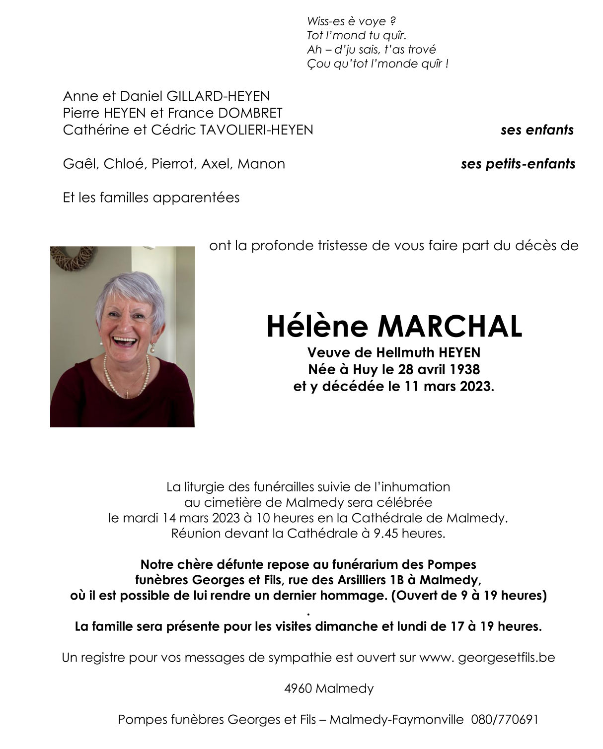 Décédée à Huy (4500) le samedi 11 mars 2023 à l'âge de 84 ans