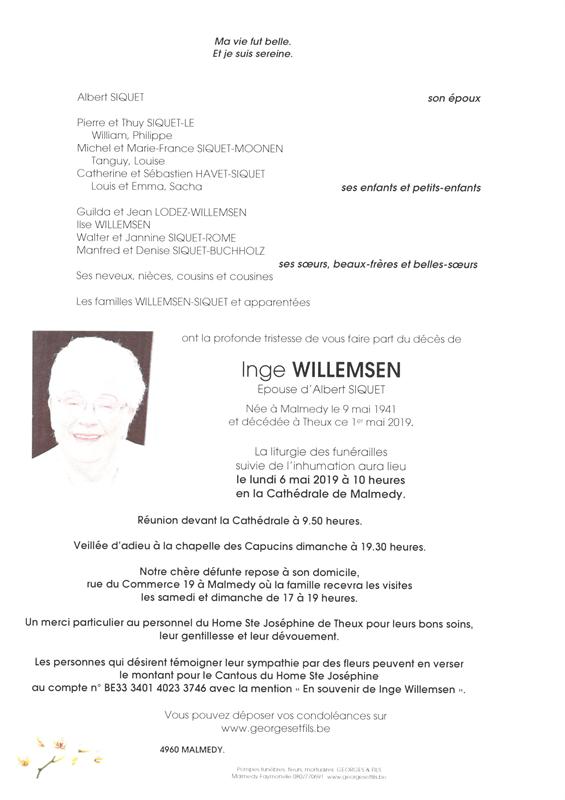 Madame Inge WILLEMSEN épouse d'Albert SIQUET