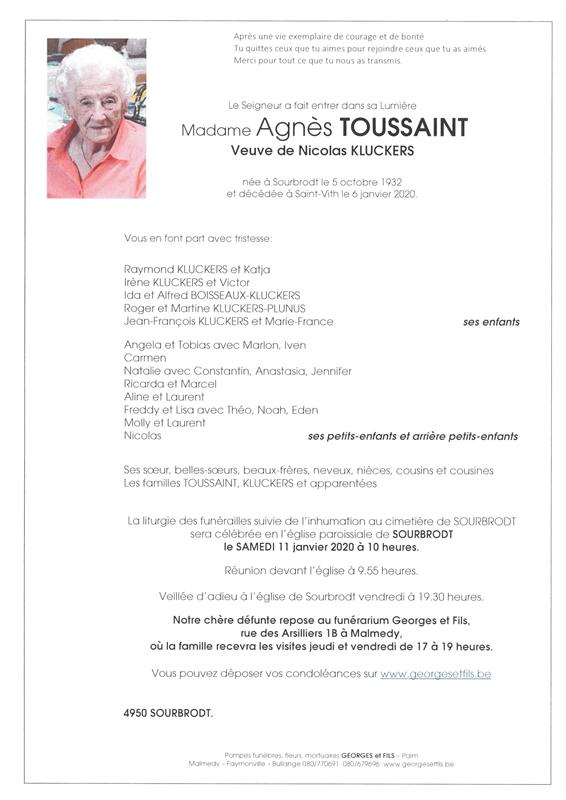 Madame Agnès TOUSSAINT veuve de Nicolas KLUCKERS