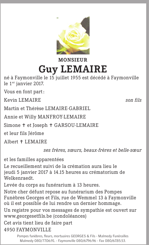 Décédé à Faymonville (4950) le dimanche 1 janvier 2017 à l'âge de 61 ans