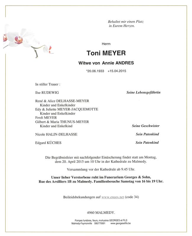Décédé à Saint-Vith (4780) le mercredi 15 avril 2015 à l'âge de 81 ans