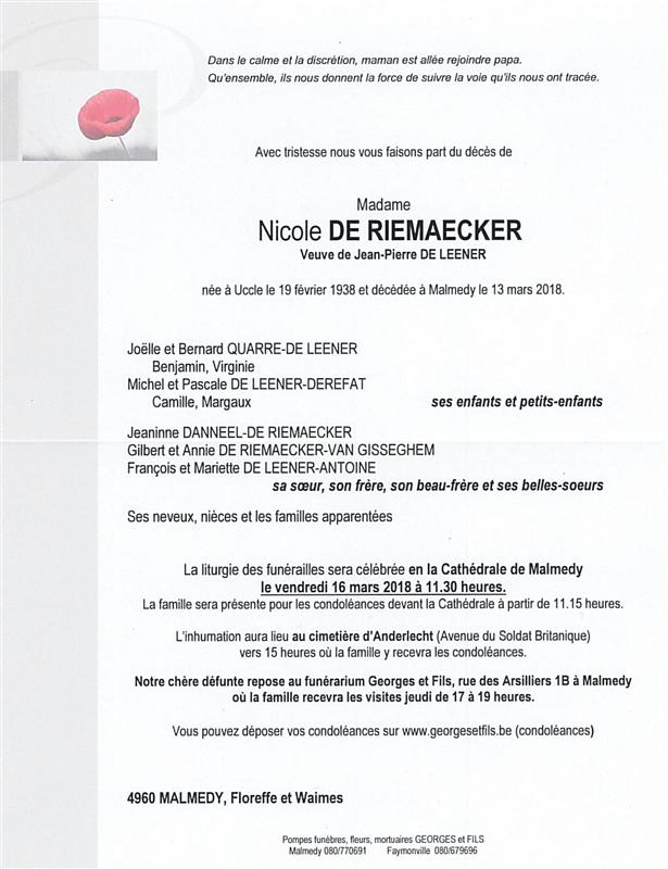 Veuve de Monsieur Jean-Pierre DE LEENER
