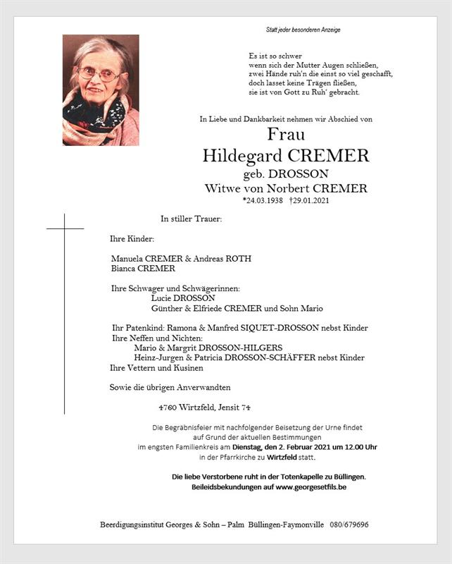 Décédée à Bütgenbach (4750) le vendredi 29 janvier 2021 à l'âge de 82 ans