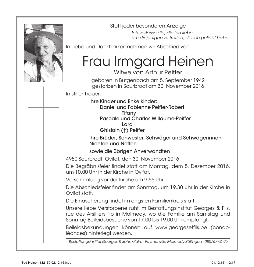 Décédée à Sourbrodt (4950) le mercredi 30 novembre 2016 à l'âge de 74 ans