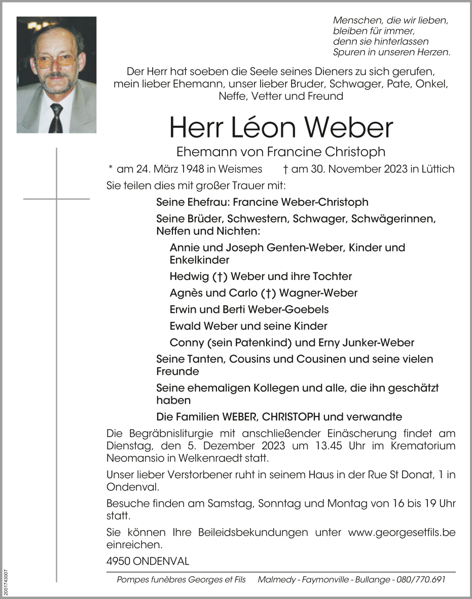 Décédé à Liège (4000) le jeudi 30 novembre 2023 à l'âge de 75 ans