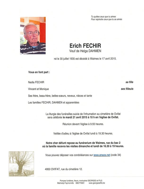 Décédé à Waimes (4950) le vendredi 17 avril 2015 à l'âge de 79 ans