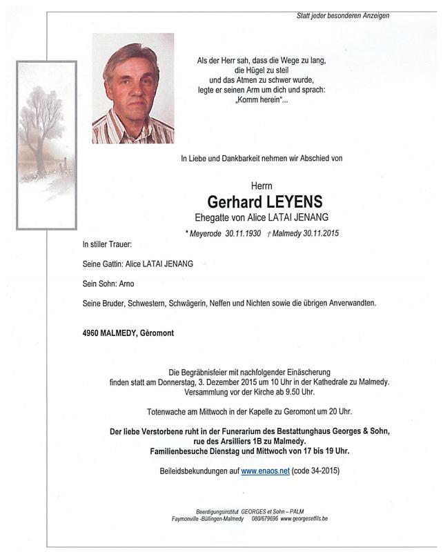 Décédé à Malmedy (4960) le lundi 30 novembre 2015 à l'âge de 85 ans