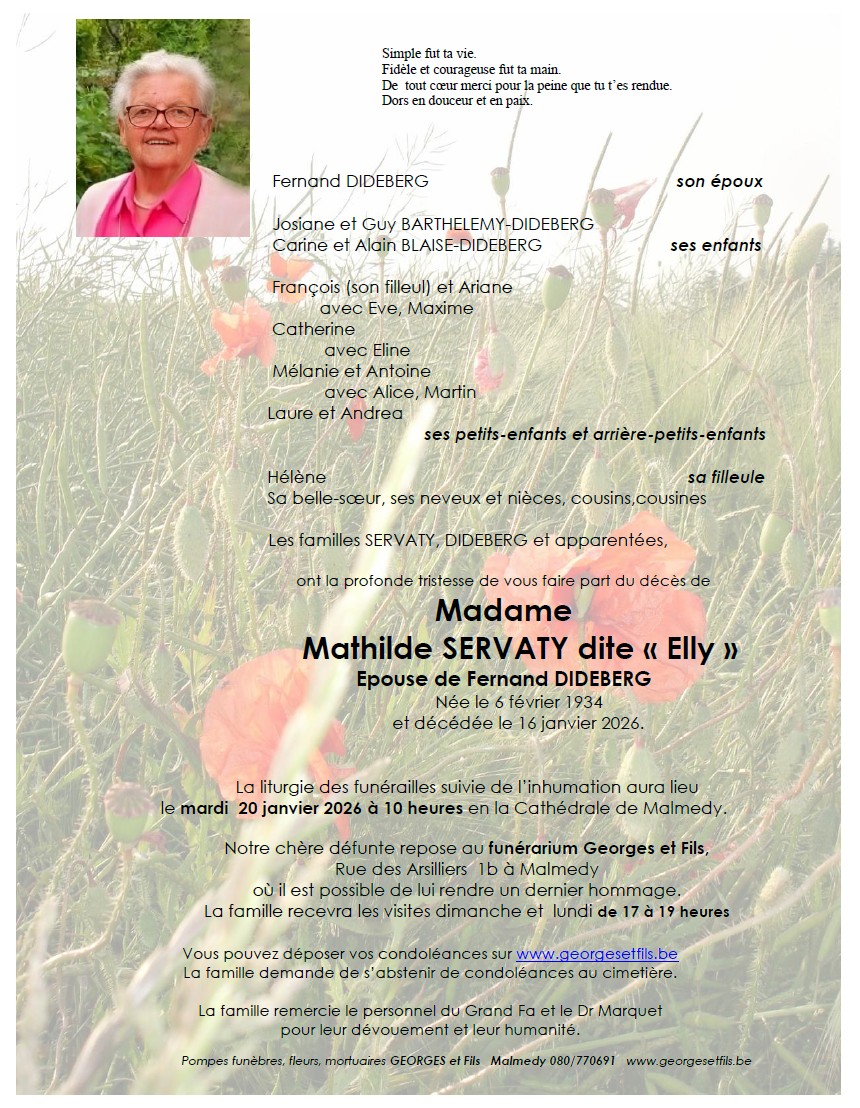 Décédée à Malmedy (4960) le vendredi 16 janvier 2026 à l'âge de 91 ans