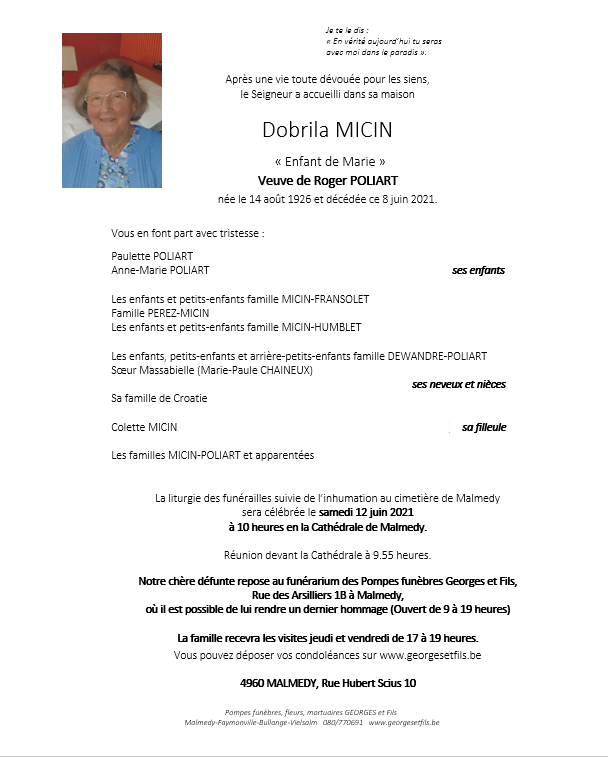 Madame Dobrila MICIN veuve de Roger POLIART