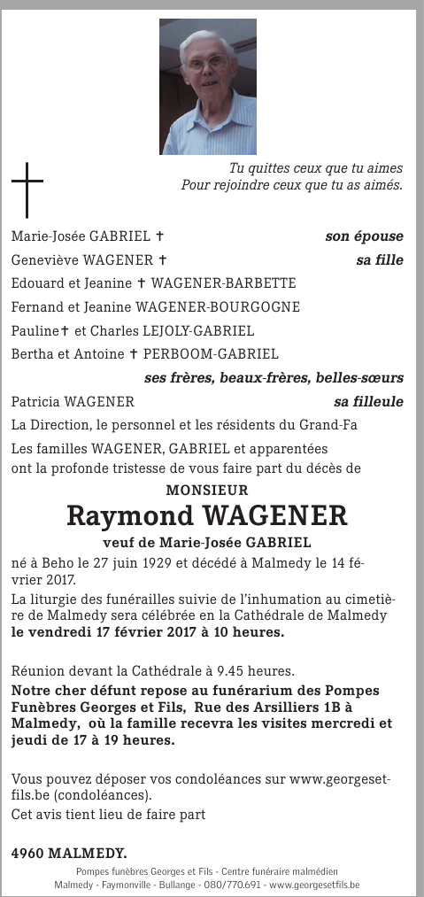 Décédé à Malmedy (4960) le mardi 14 février 2017 à l'âge de 87 ans