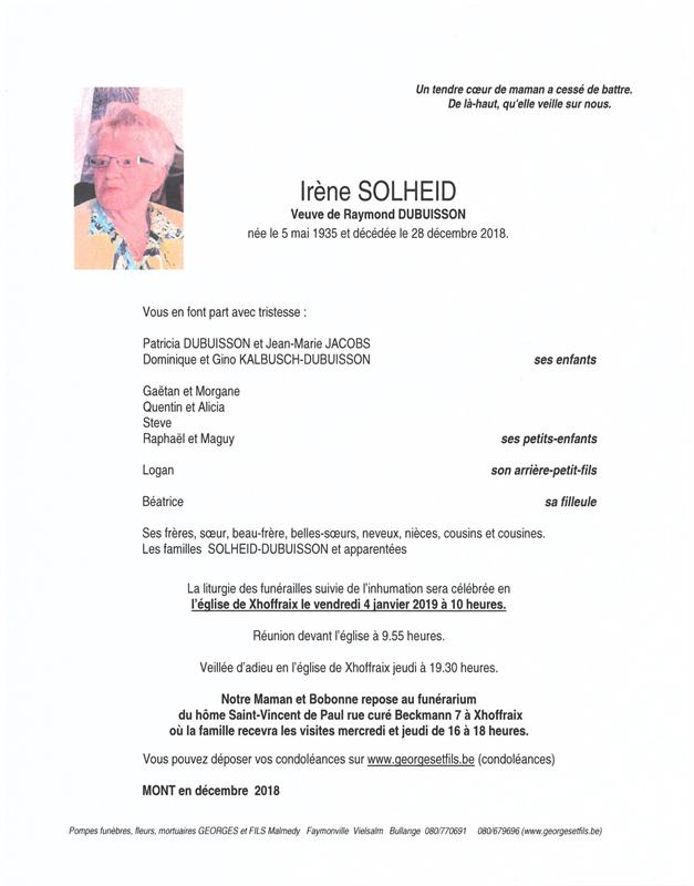 Décédée à Malmedy (4960) le vendredi 28 décembre 2018 à l'âge de 83 ans