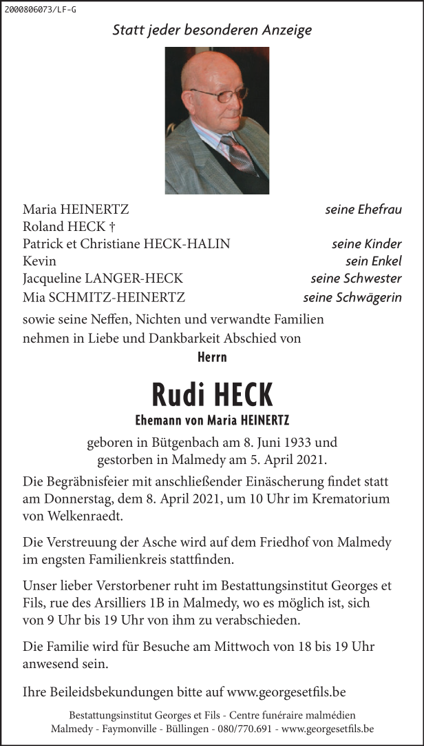 Décédé à Malmedy (4960) le lundi 5 avril 2021 à l'âge de 87 ans