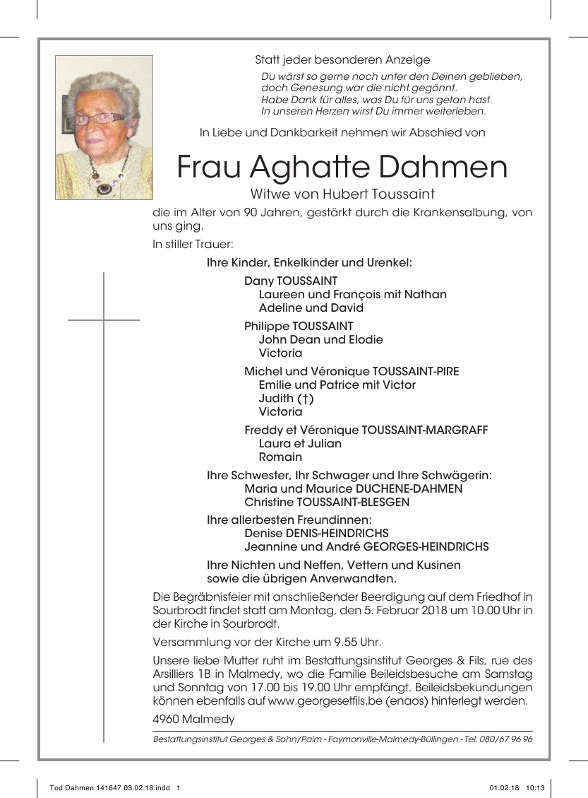 Madame Ady DAHMEN veuve de Hubert TOUSSAINT
