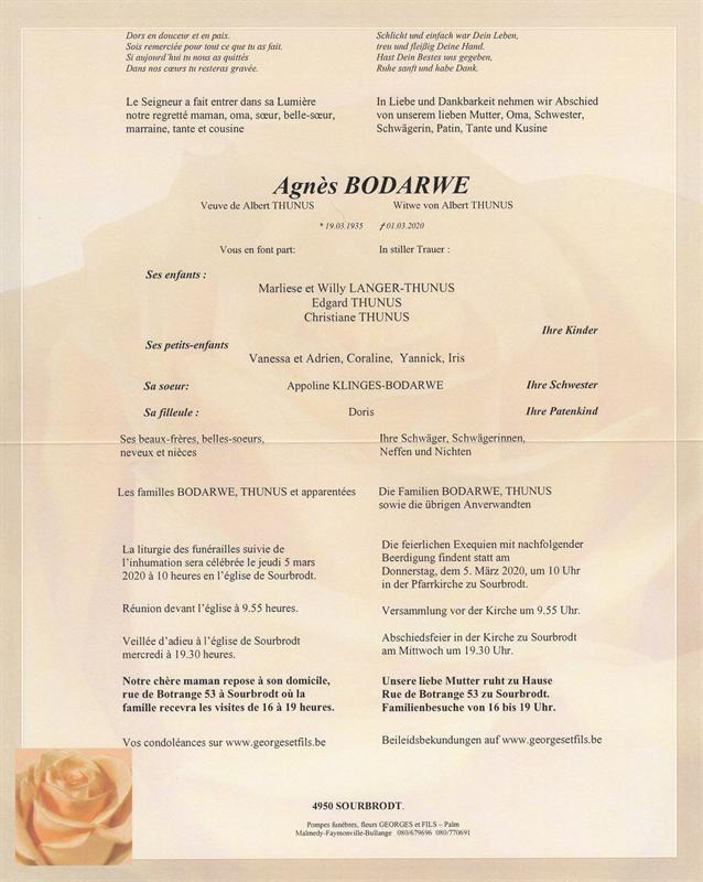 Née à Sourbrodt (4950) le mardi 19 mars 1935