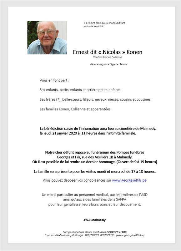 Décédé à Malmedy (4960) le lundi 18 janvier 2021 à l'âge de 94 ans