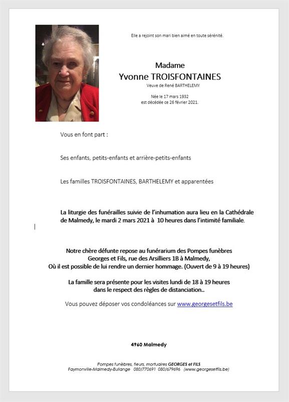 Madame Yvonne TROISFONTAINES veuve de René BARTHELEMY