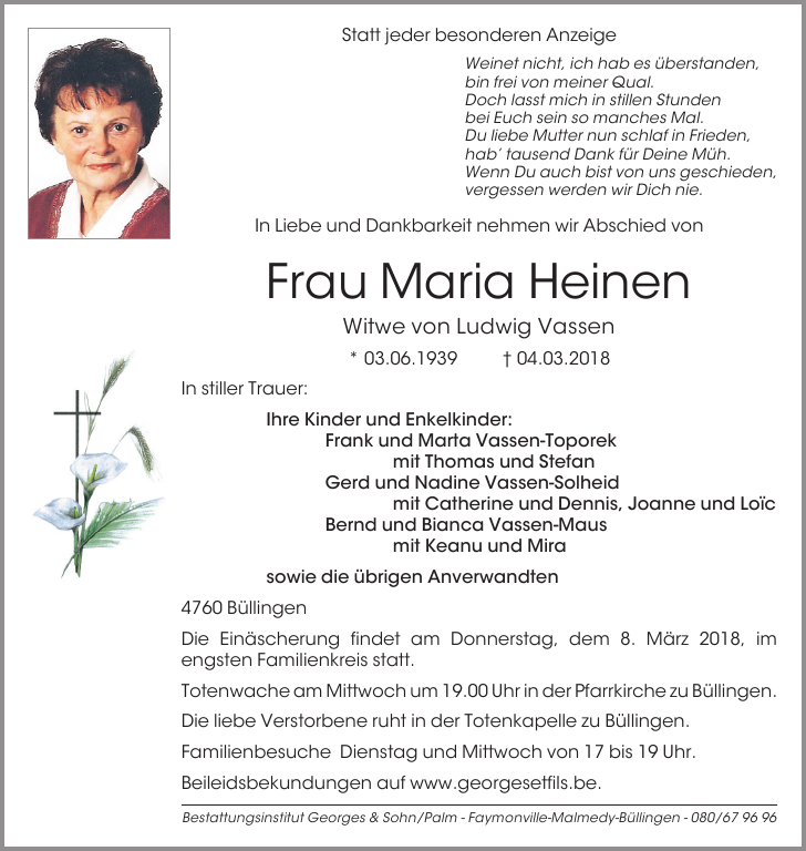 Décédé à Bütgenbach (4750) le dimanche 4 mars 2018 à l'âge de 78 ans