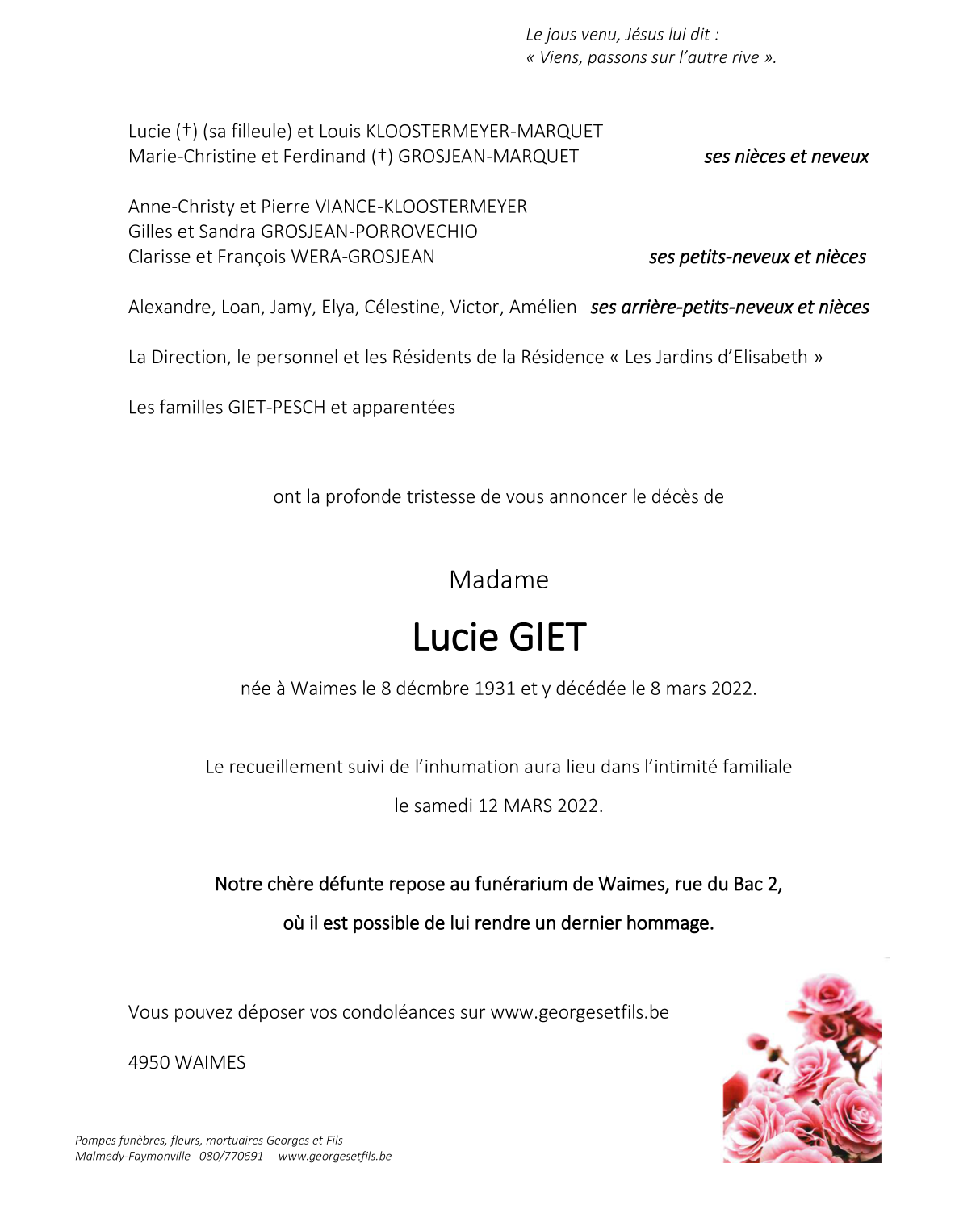 Décédée à Waimes (4950) le mardi 8 mars 2022 à l'âge de 90 ans