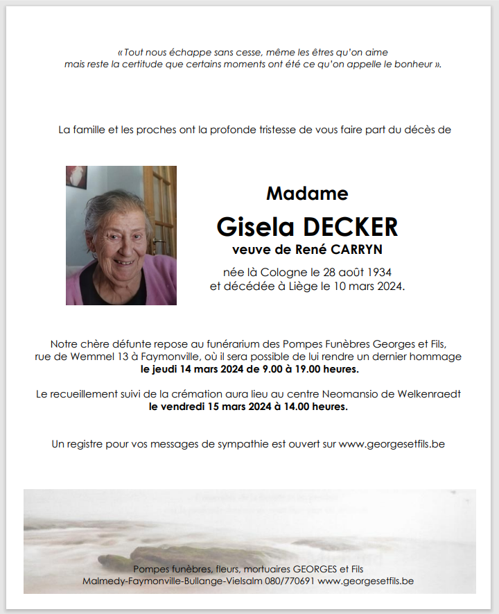 Décédée à Liège (4000) le dimanche 10 mars 2024 à l'âge de 89 ans