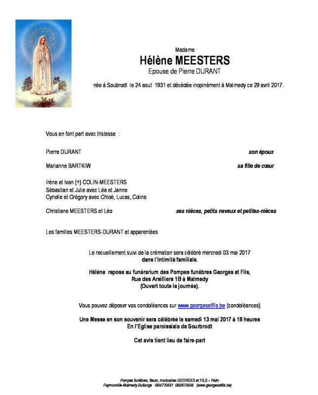 Décédée à Malmedy (4960) le samedi 29 avril 2017 à l'âge de 85 ans