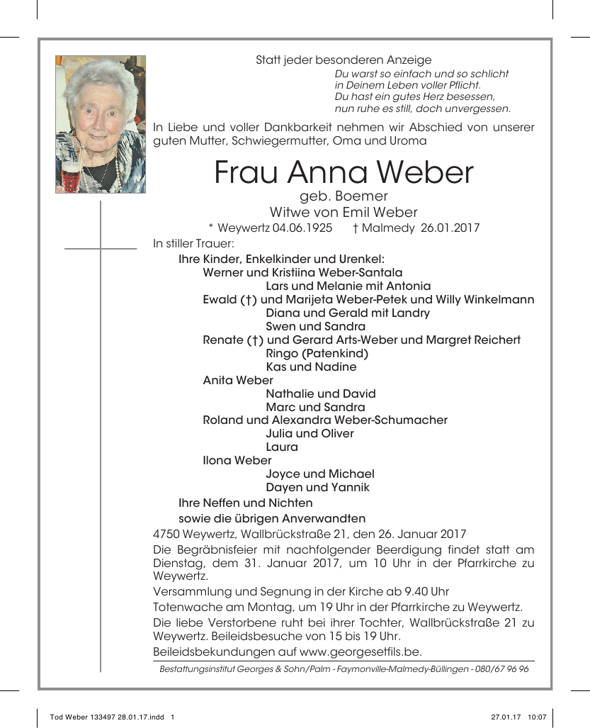 Décédée à Malmedy (4960) le jeudi 26 janvier 2017 à l'âge de 91 ans